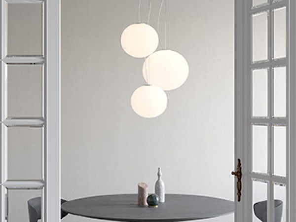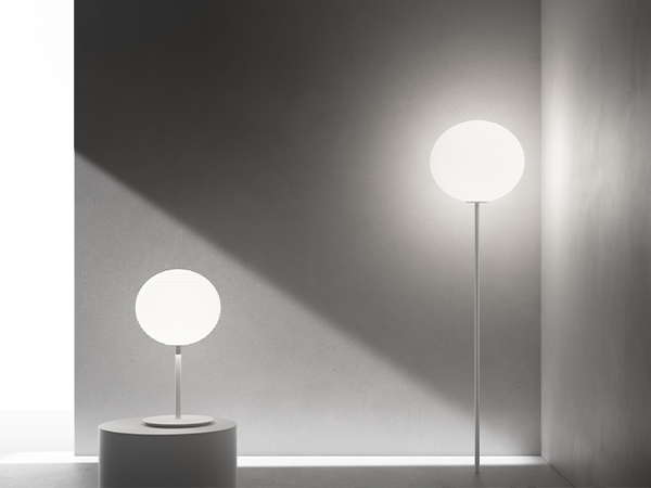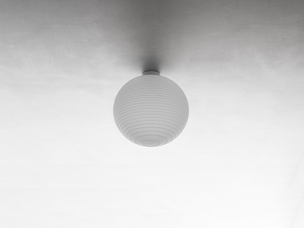 This is a family of table, suspension and floor diffused light lamps. The blown glass diffuser features thin rings in relief that create a geometry similar to that of oriental paper and bamboo lanterns, while reproposing the Flow lamp image.