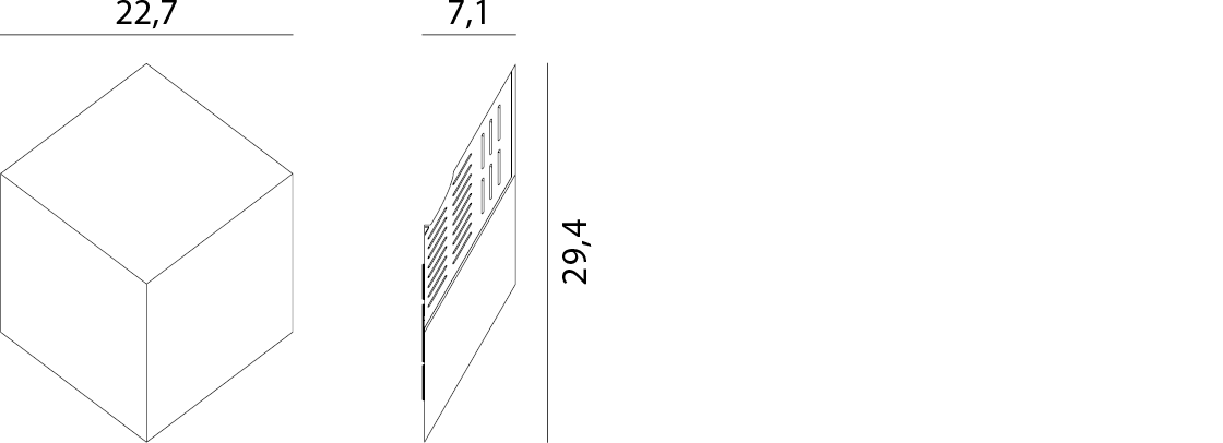 La forma del cubo incastonato nel muro è solo un effetto prospettico. La lampada, costruita in alluminio pressofuso, sporge dalla parete solo di pochi centimetri per distribuire nell’ambiente un potente flusso di luce indiretta.